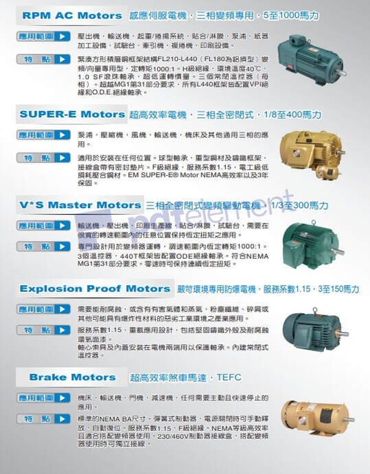 IEC高效率三相感應馬達 效率等級:IE3 IEC公制框架,TEFC,IP55 特色: 節能、高效率;高啟動扭力/轉矩,低啟動電流 多功能設計(對於不同運用種類容易修改) 一體成型的腳座或可移除的腳座之選擇 端子箱位置之選擇(頂部、左邊或右邊) 對於IEC標準和高效率有IE1、IE2、IE3之選擇 全面使用冷軋矽鋼磁化特性(定子疊片被均勻磁化以減低線圈之溫度上升) 裝置:標準的IMB3、B5,或是可依需求提供IMB14、B34、B35之選擇 其他配件如PT100的軸承、PT100的線圈、局部供熱裝置等等 電壓變化(+/- 10%);頻率變化(+/- 5%);絕緣等級(F);溫昇等級B 保護等級:IP55;環境溫度40C;服務系數1.0油脂:SINOPEC鋰基潤滑脂 應用 幫浦;空氣壓縮機;風機,廢水處理廠;應用於農業 減速機和動力傳動裝置 紙漿廠和造紙廠;鋼廠 傳送裝置、電梯/升降機 原料處理裝備 採礦設備;液壓設備 技術規範 / Technical specifications 標準 / Standards IEC 60034, IEC 60085, IEC 60072, IEC 60038 接線類型 / Contection types Y / △ 連接 // Y / △ Contection 級數 / Number of poles2, 4, 6, 8 額定轉速 / Rated speed 750 … 3000 rpm (50 Hz) / 900 … 3600 rpm (60 Hz) 額定輸出 / Rated output 2P: 0.75 kW - 315 kW / 4P: 0.75 kW - 315 kW /6P: 0.75 kW - 250 kW 服務系數 / Service factor S. F. : 1.0 (可客製化S. F. : 1.5)額定轉矩 / Rated Torque2.5 … 2450 Nm 定子繞組絕緣 / Insulation F 級絕緣B級溫升 / Class F, used acc. To class B 保護等級 / Degree of protection IP55 as standard冷卻 / Colling 自帶風扇冷卻 / 外加強制風扇冷卻 最大周溫及標高 / Temperature and altitude海拔1000公尺以上 / 1000 m above sea level / -20°C … 40°C 標準電壓 / Standard voltage 230V: 220V - 240V , 400V: 380V - 415V , 460V: 440V - 480V 安裝類型 / Type of construction B3-腳座, B5-法蘭, B14-C型表面法蘭 B34-腳座/C型表面法蘭, B35-腳座/法蘭 塗裝 / Paint finish 標準:鐵灰色